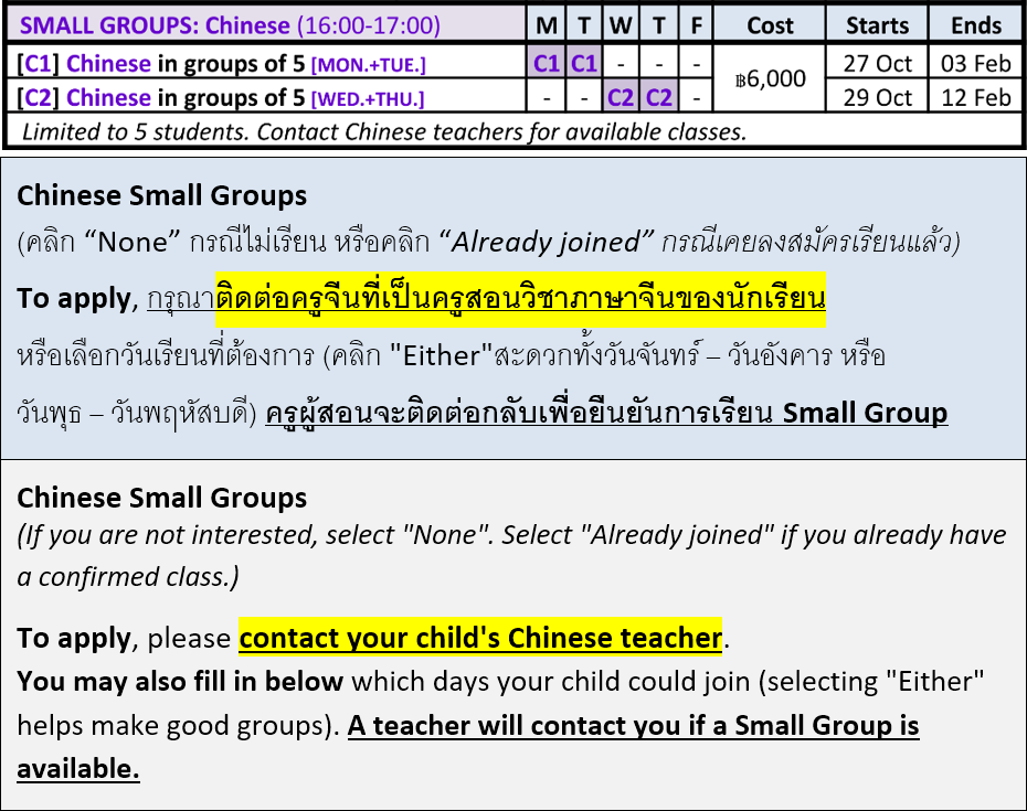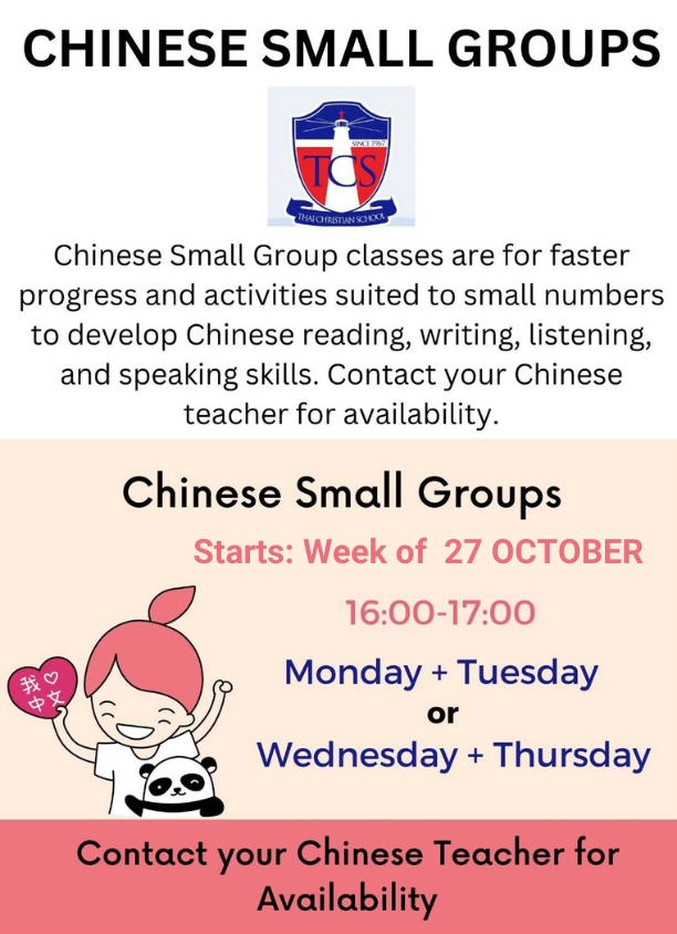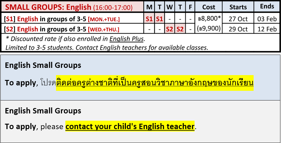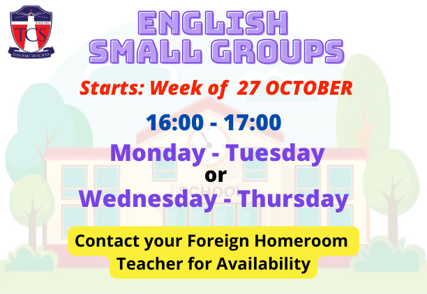 English Small Group classes (16:00-17:00, Mon+Tue or Wed+Thu) are for faster progress and activities suited to small numbers to develop English reading, writing, listening, and speaking skills. Contact your foreign homeroom teacher for availability.